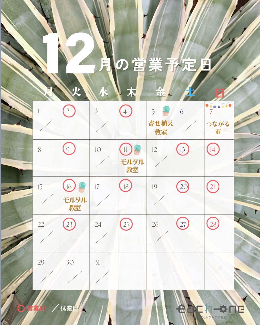 遅くなりましたが、12月の営業カレンダーとなります😊