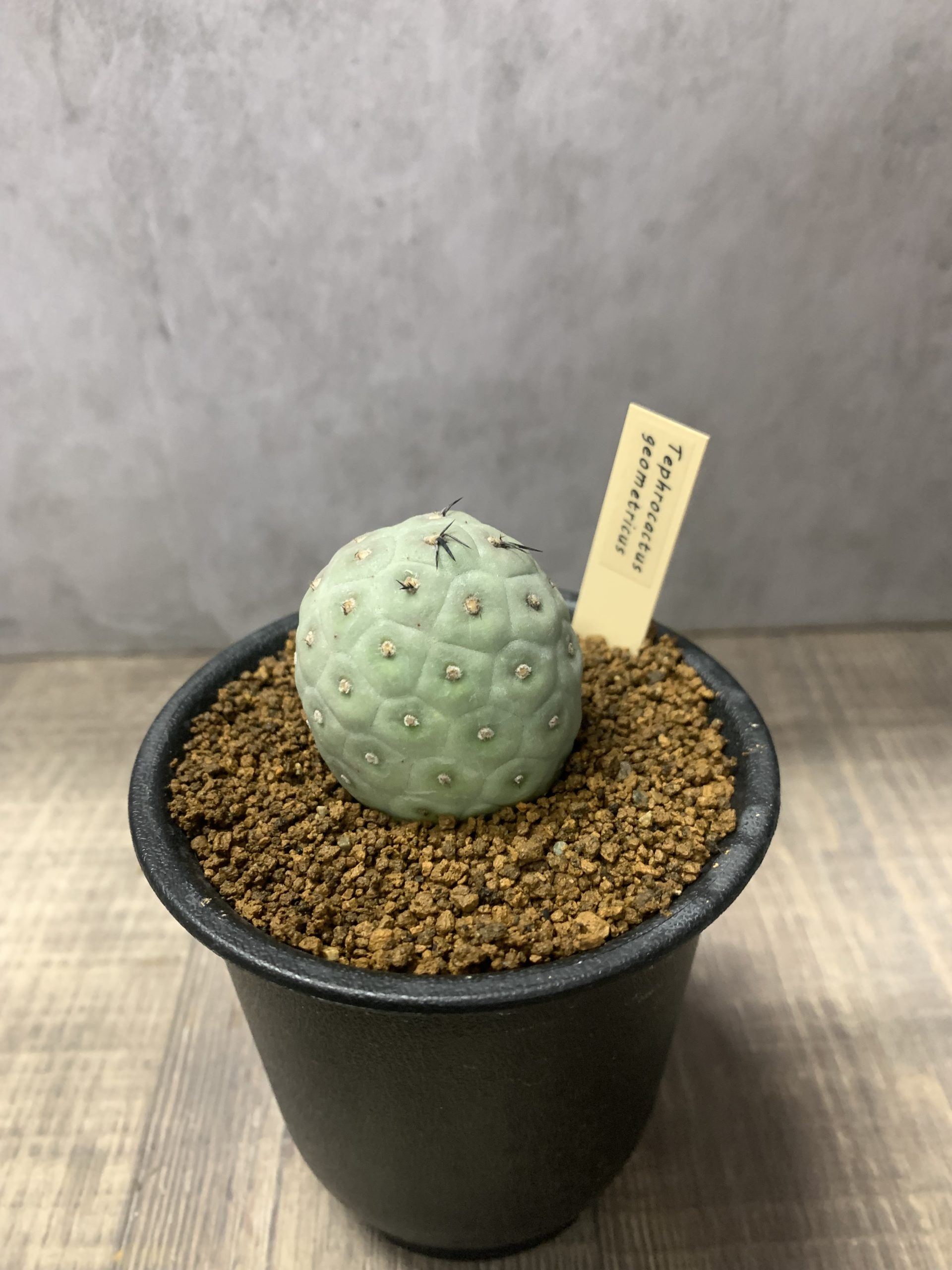 テフロカクタス ゲオメトリクスは灰青色(スモーキーグレー)の丸い球体が連なって成長する、幾何学的な見た目が特徴的なサボテンです。